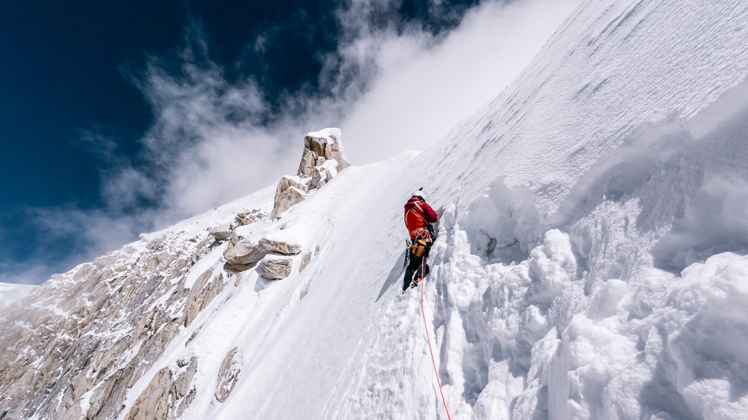 Mathieu: “I admit it was tough: I felt responsible for every decision. For Mueez it was his first experience of this kind, and we had a couple of delicate moments. On the last night on the wall, it snowed much more than forecasted. That stressed us a lot and forced us to change plans, because the original line was loaded with too much spindrift. The second difficult moment came during the descent: we were completely drained, with deep fresh snow and many crevasses. We descended to 5,800 meters, where we bivouacked one last time. And then, on the final day, just to reach our skis at the base of the wall, we had to hold our breath while crossing steep east-facing slopes, warming quickly under the morning sun...”